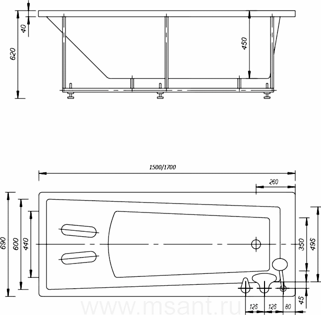 Акриловая ванна Pin Up Либра 170x70, с каркасом, сливом-переливом, без фронтального экрана